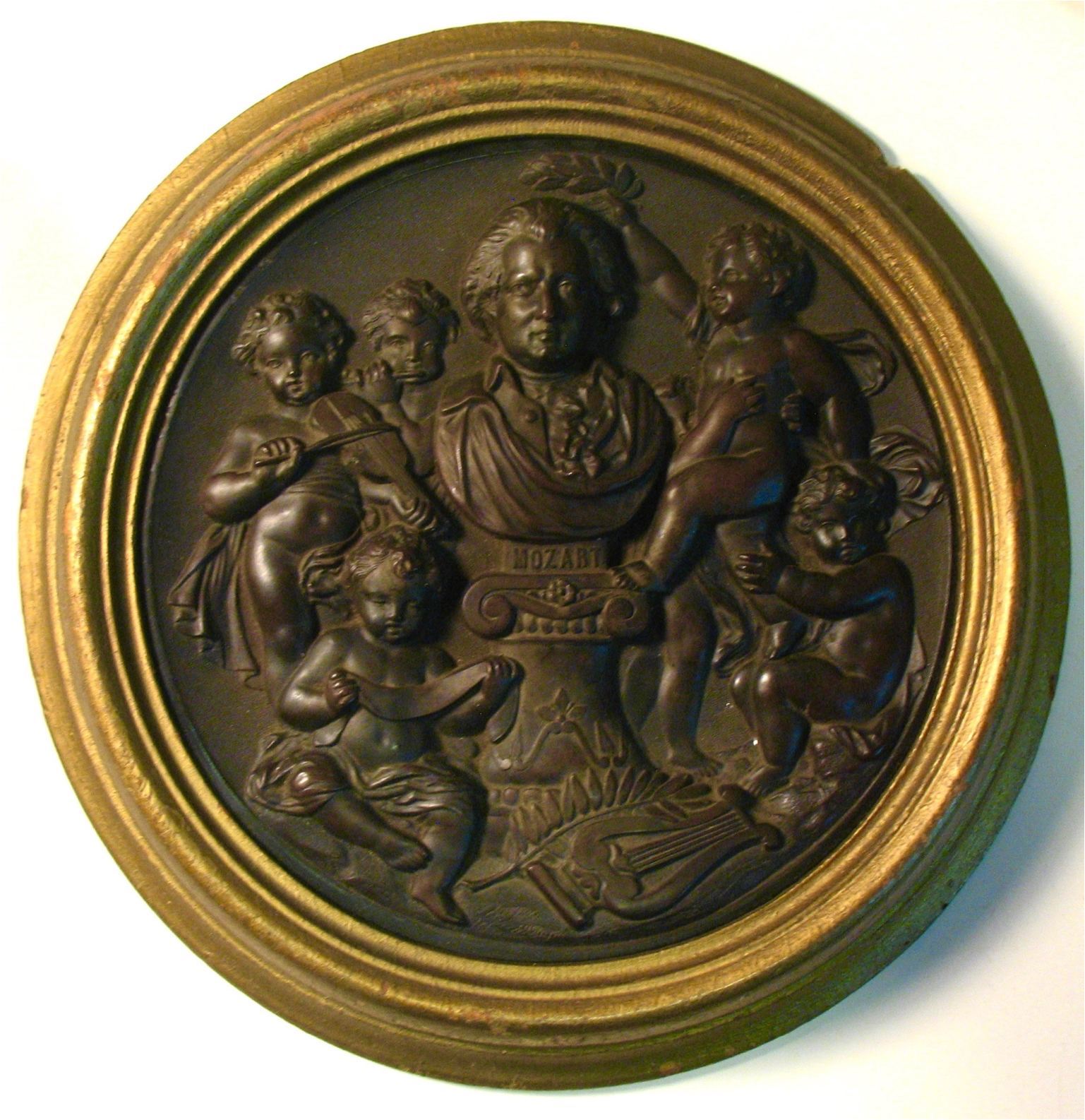 Bust of Mozart crowned by cavorting putti. Bois durci, 162 mm. in gilt wood frame, total diameter 211 mm. Another, without frame.
