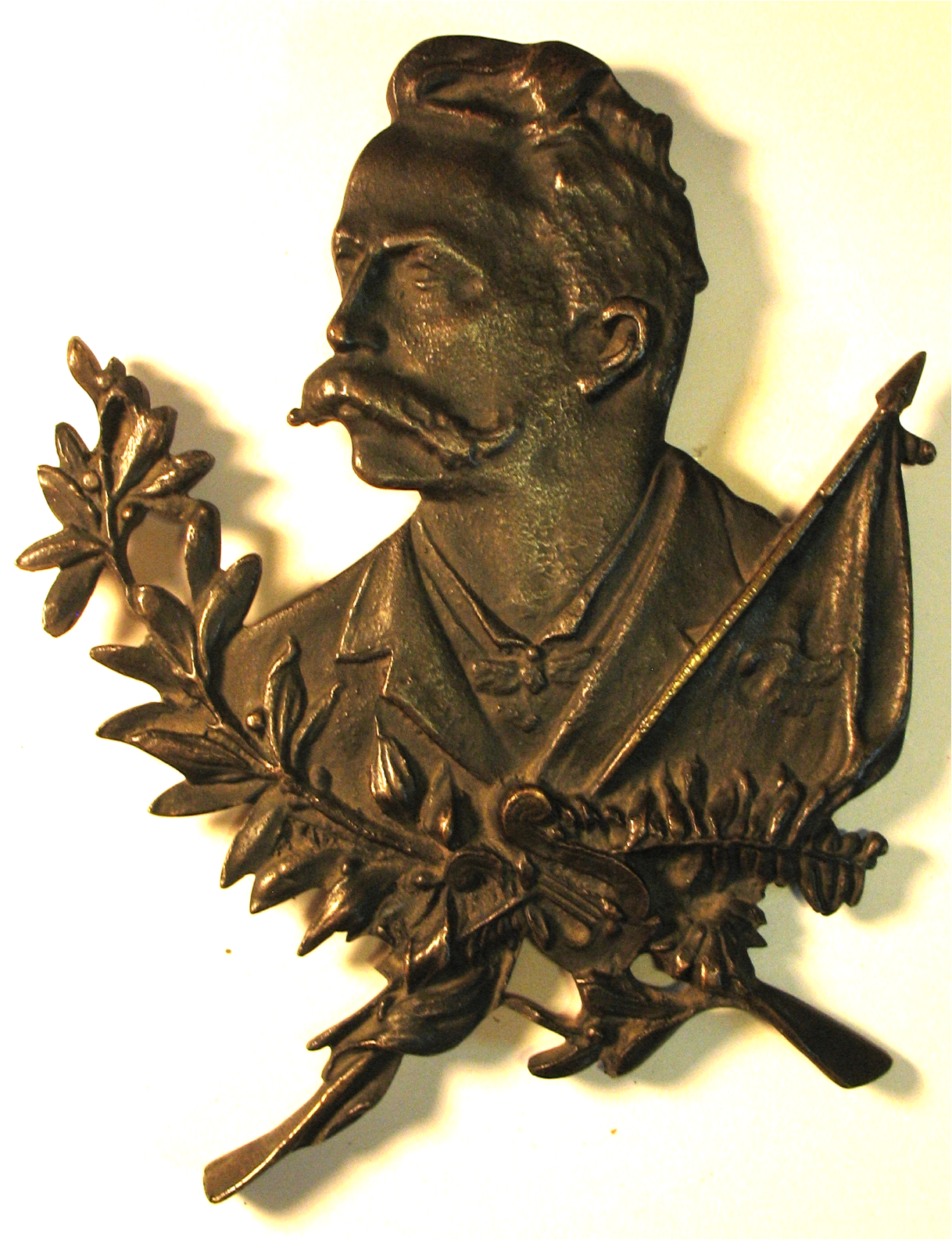 Unsigned, mid-career portrait, with trophies below. Elaborate silhouetted cast plaque with easel mount on back. 165 x 200 mm. Number 3768 on our inventory of personal medals. $195.
