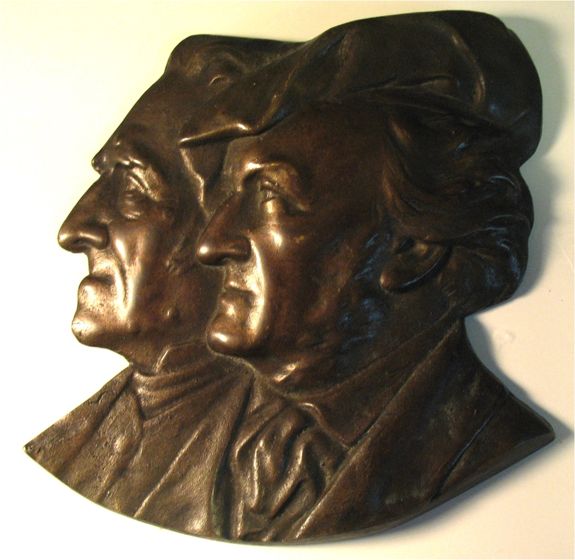 Jugate portraits, left, silhouetted, cast bronze with screw sprues on back, 160 x 170 mm. Number 3777 on our inventory of personal medals.