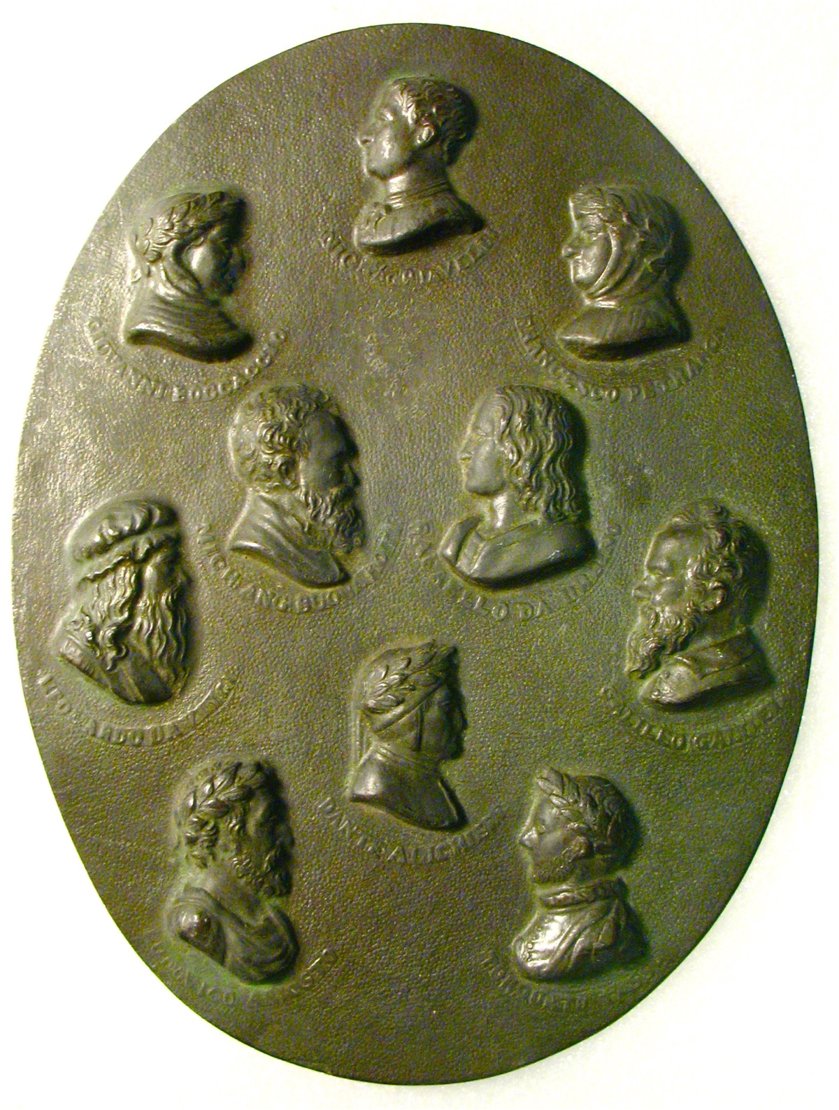 Portraits of Boccaccio, Machiavelli, Petrarch, Michelangelo, Raphael, Leonardo, Galileo, Dante, Ariosto and Tasso.